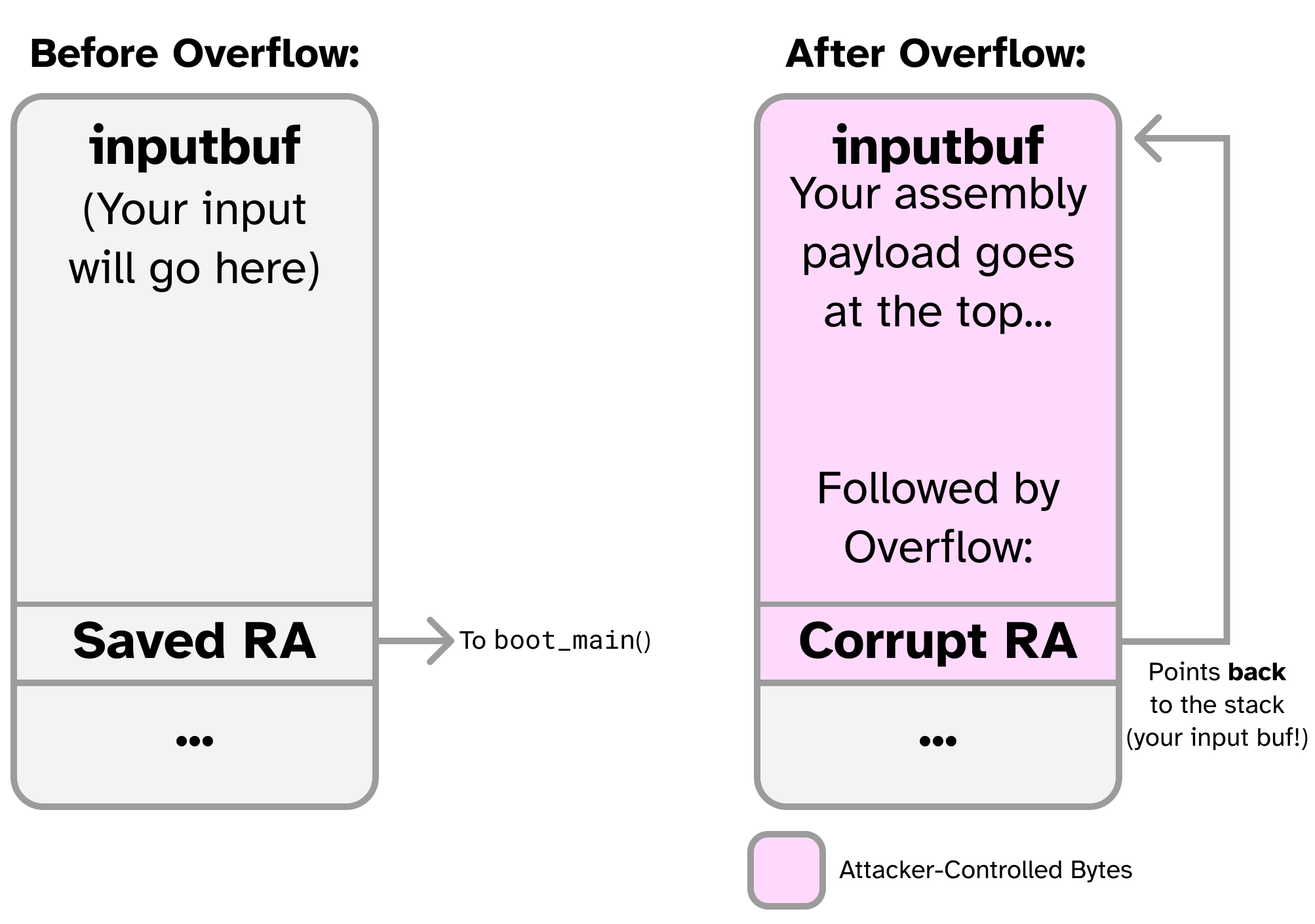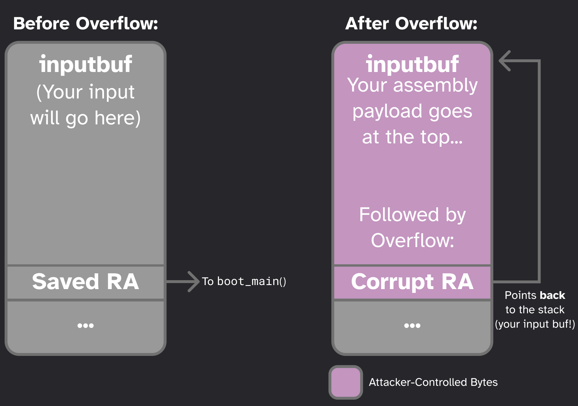 In Part 4.3, we will use the ability to control pc to cause the CPU to jump to our own input buffer (where the username field goes). We will fill that input buffer with the code from Part 4.2 and send it to the CPU over serial. Then, we will use the buffer overflow to trick the CPU into jumping to the buffer, running the shellcode and granting us machine privileges.